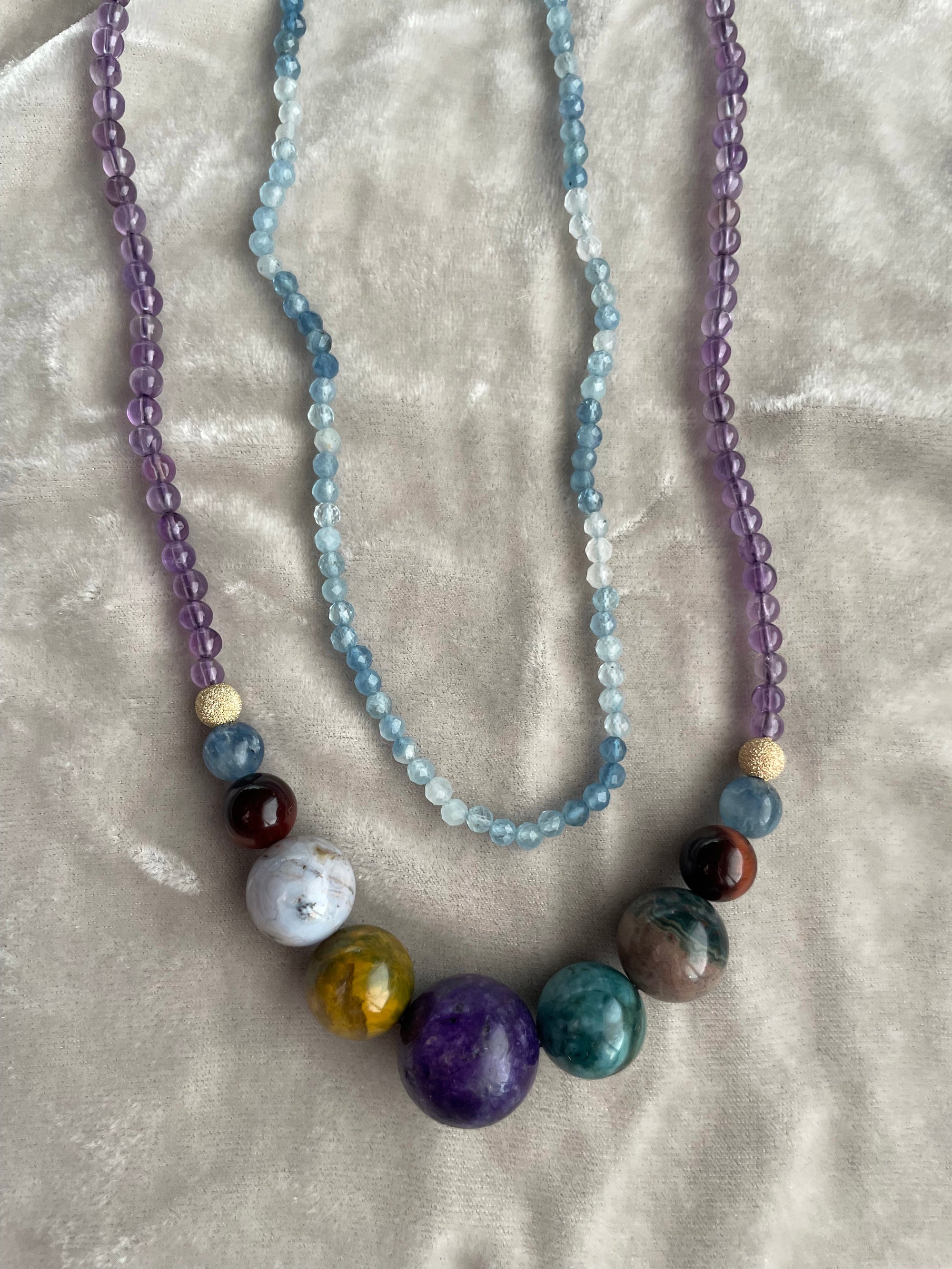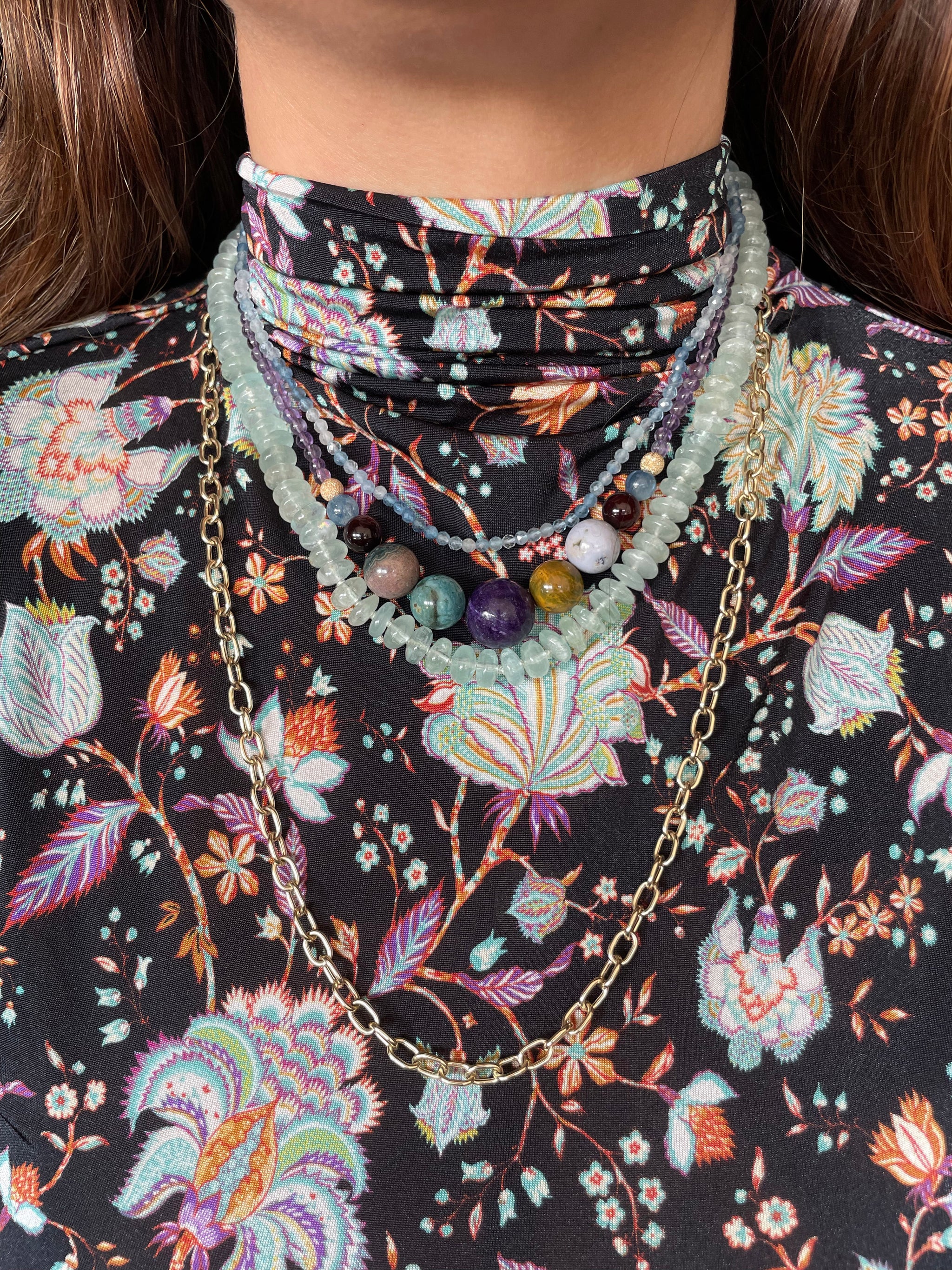 We search the world to find the dreamiest beads to adorn your neck. Sumptuous gems are hand selected, strung and knotted with colorful silks to make a piece that layers perfectly with your collection or shines all on its own. Each necklace is finished with a 14k yellow gold lobster clasp that keeps your beads secure during all of your adventures. Due to the one of a kind nature of these jewels, the patterns, size and colors within the stones may vary.
