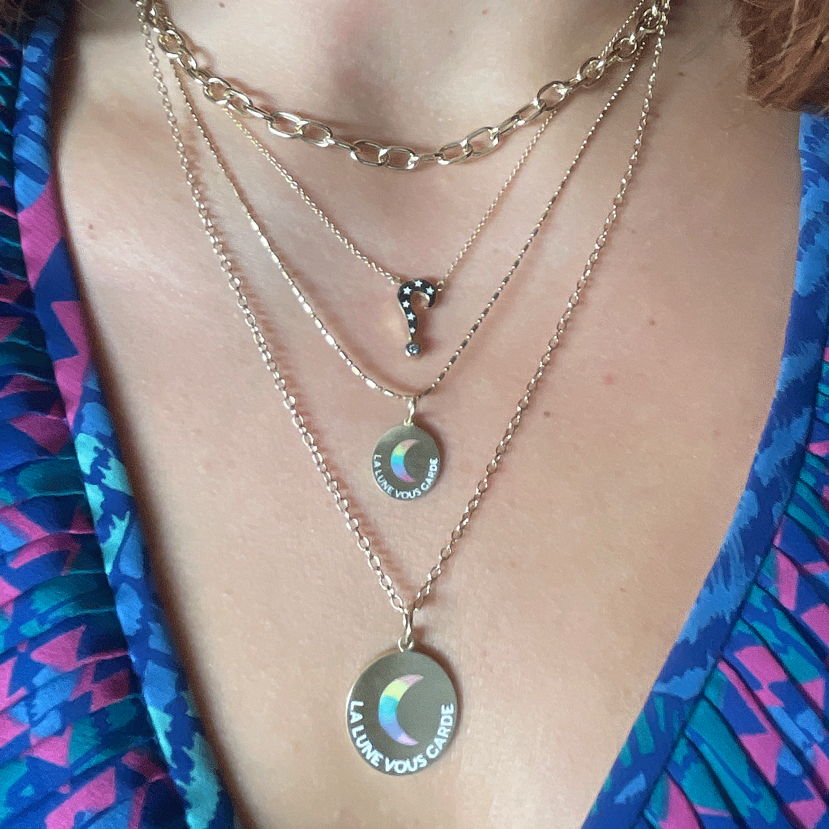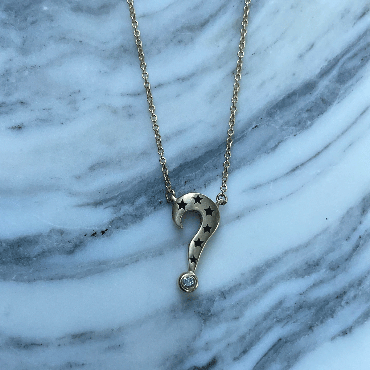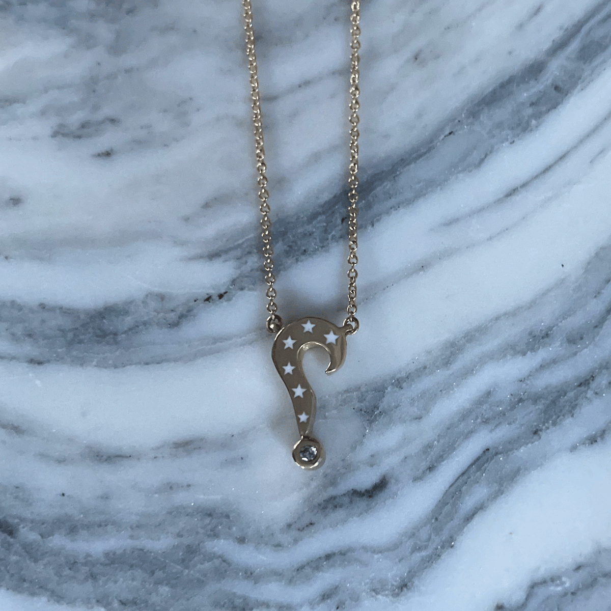 The Beautiful Question Necklace in 14k yellow gold is our wearable reminder to embrace the questions in life. What's scarier than the uncertain and the unknown? Not much! But we also believe that's where all the good stuff and the magic in life lies. This is a two in one necklace! It is reversible with black stars and brushed gold adorning one side, and white stars with mirror polished gold on the other side. Both sides have a glittering grey diamond, all of which come together to reflect the mysterious duality of the unknown.